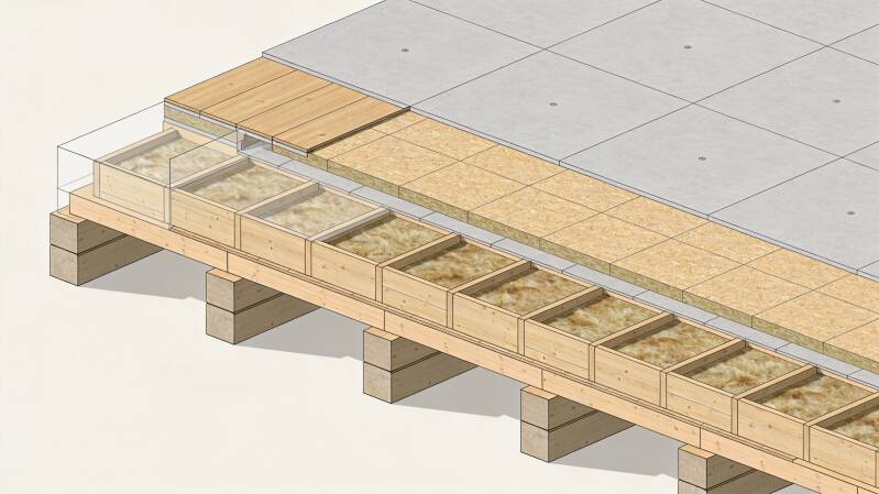 Het vloeroppervlak wordt opgebouwd op liggers die zelf op stalen steunen van de ponton liggen. De eerste laag is een vloer van plaatmateriaal. Daarop komen de bouwelementen die afgevuld worden met isolatievezels, waarna weer plaatmateriaal volgt. Dit vormt de basis van je zelfgebouwde woning.